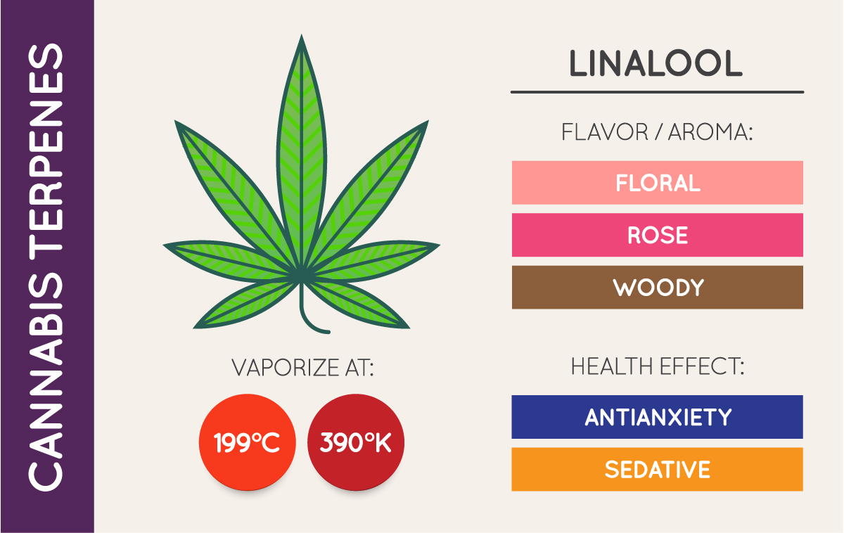 Linalool, a terpene found highly concentrated in lavender and cannabis, has a deeply woody, spicy, and floral scent. Laurel, birch, rosewood, and coriander are other plants that have an aroma largely dominated by linalool. This terpene is also prominent in some citrus fruits.