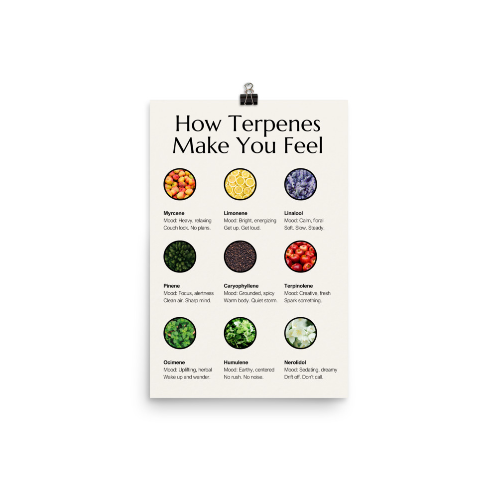 This museum-quality poster maps out how common cannabis terpenes affect mood and experience, making it a must-have for stoners, students, and terp-curious minds alike.